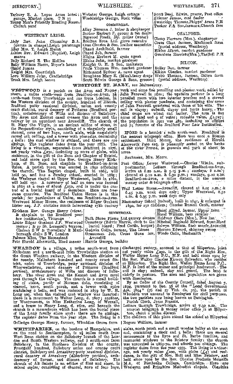 Page 251 Westbury; businesses from Yerbury to Young; Westbury Leigh, Chalford, Dilton. Description and residents of Westwood, Whaddon (Hilperton), and Whiteparish.