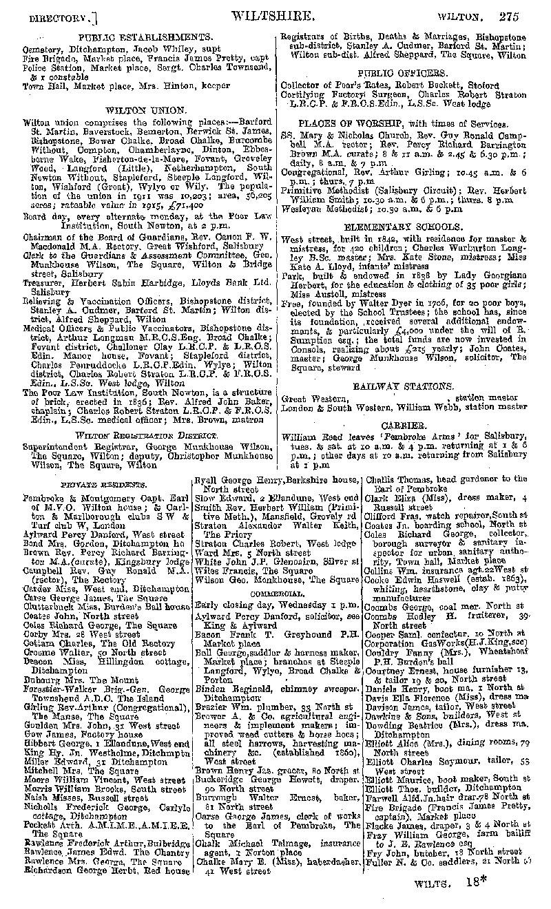Page 255 Wilton; official establishments and local institutions, churches and chapels, schools, railway, carriers; private residents, businesses from Aylward to Fuller.