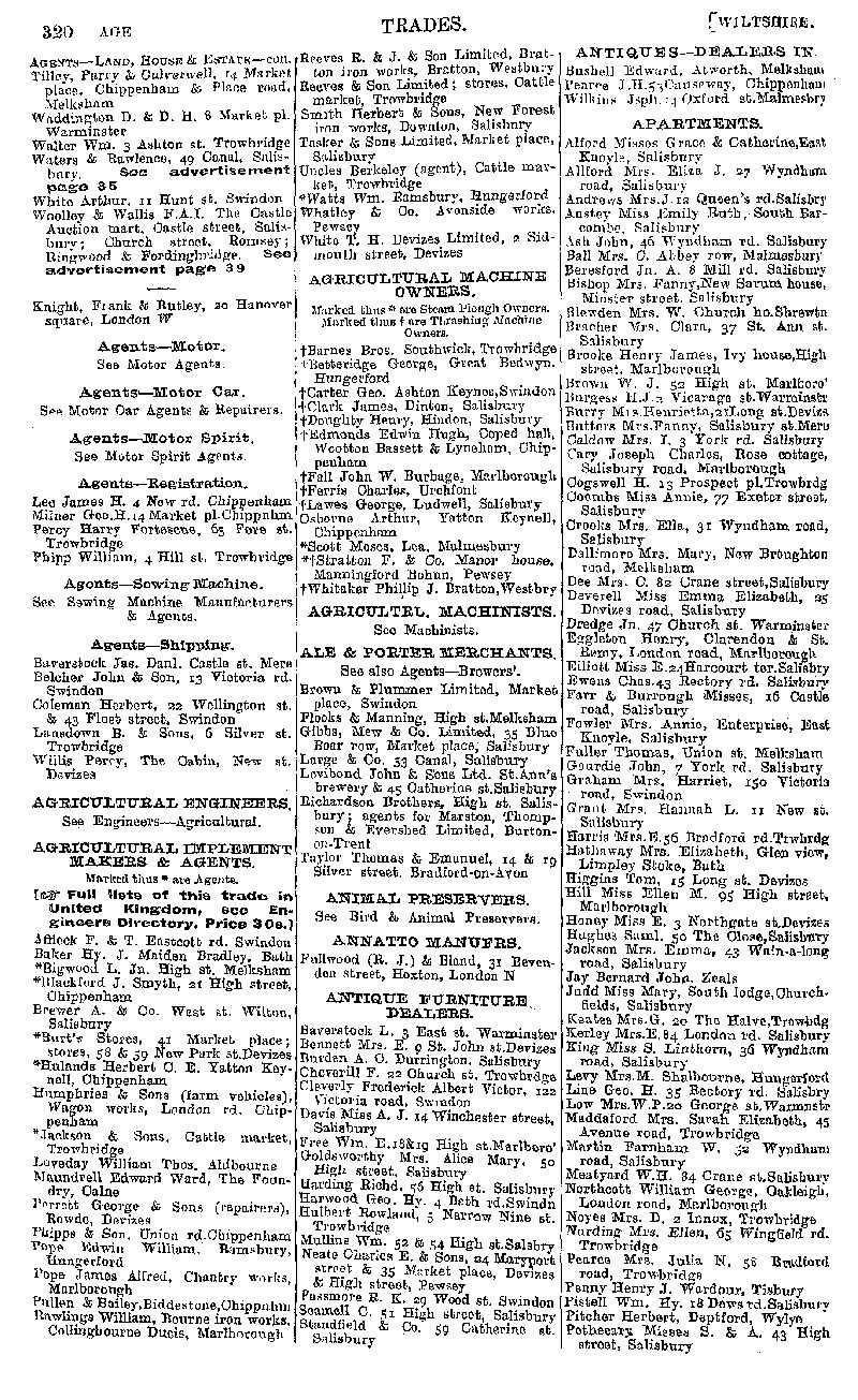 Page 30 Businesses by subject; agents, agricultural implement makers, agricultural machine owners, ale and porter merchants, antique furiture dealers, apartments.