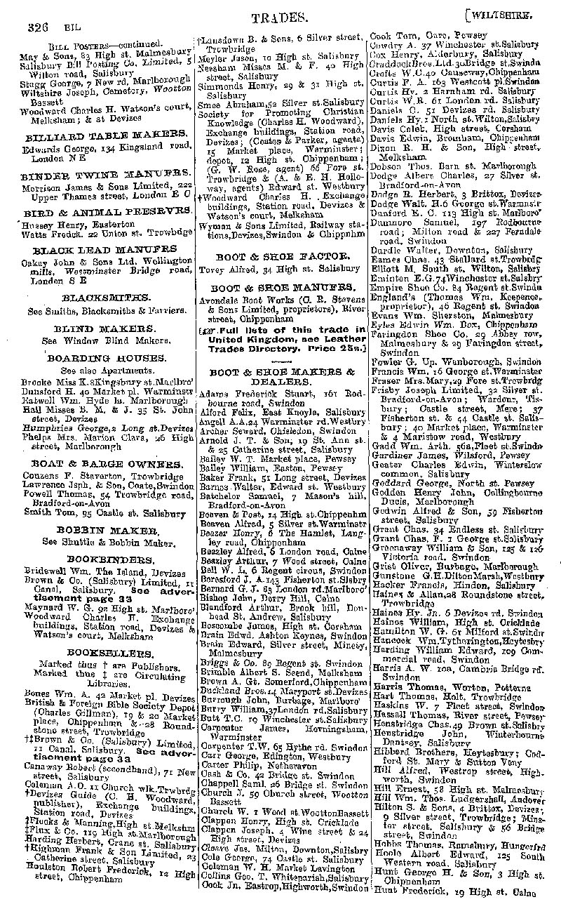 Page 36 Businesses by subject; bill posters, bird & animal preservers, boarding houses, bookbinders, booksellers, boot & shoe makers & dealers.