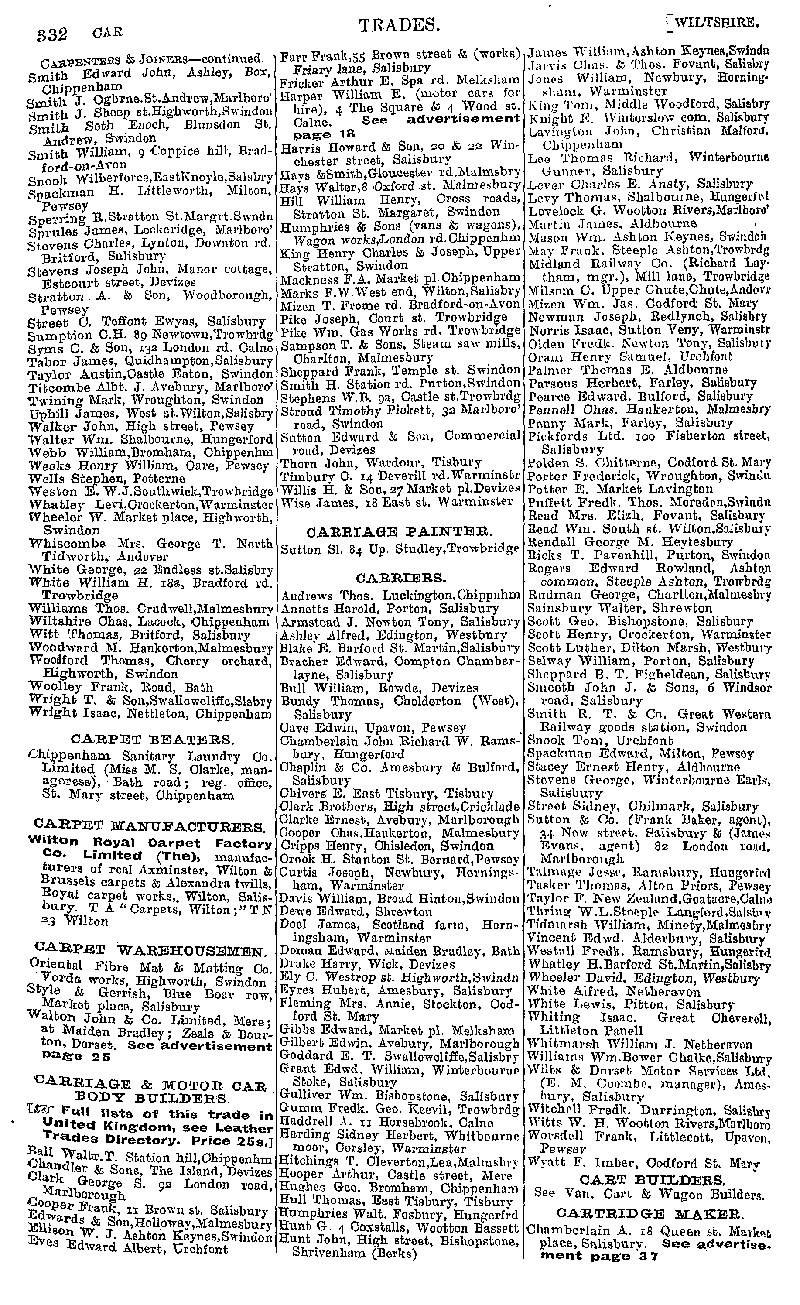 Page 42 Businesses by subject; carpenters & joiners, carpet beaters, carpet manufacturers, carpet warehousemen, carriage & motor car body builders, carriage painter, carriers, cartridge maker.