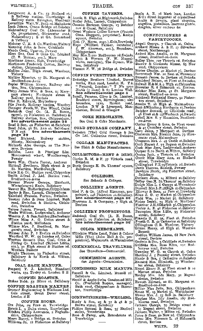 Page 47 Businesses by subject; coal & coke merchants, coffee roaster, coffee rooms and taverns, cold storage company, debt collectors, colliery merchants & proprietors, color merchants, condensed milk manufacturers, confectioners & pastrycooks.