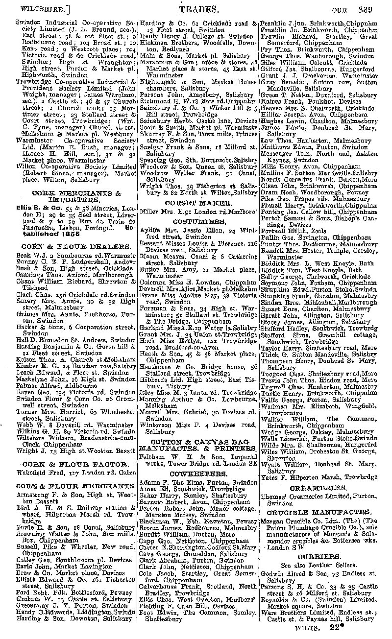 Page 49 Businesses by subject; co-operative societies, corn & flour dealers, factors & merchants, corset maker, costumiers, cowkeepers, creameries, curriers.