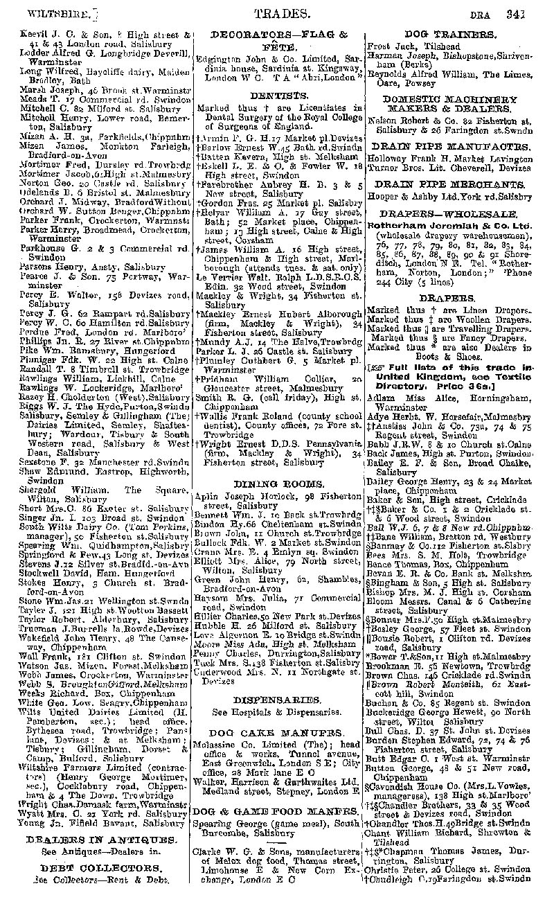 Page 51 Businesses by subject; dairymen, dentists, dining rooms, dog & game food manufacturers, dog trainers, domestic machinary makers, drain pipe makers & dealers, drapers.