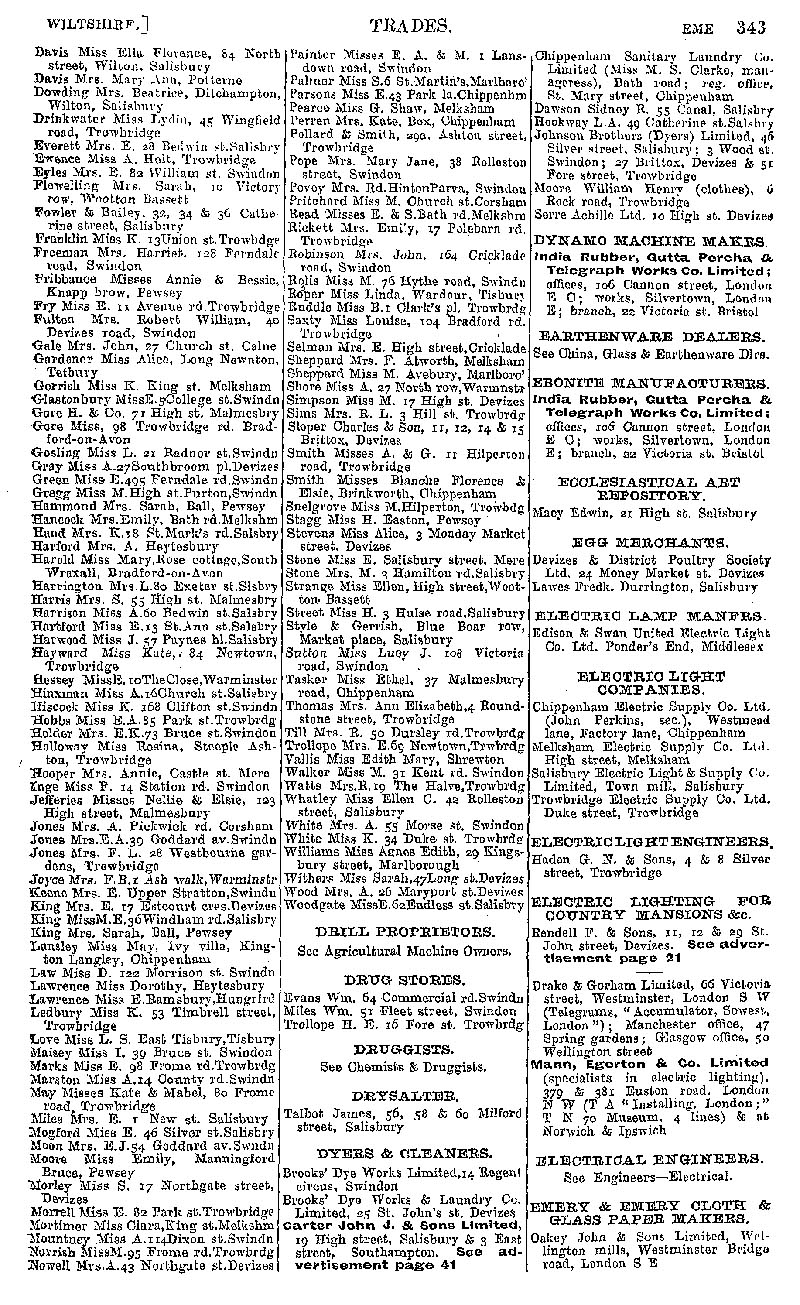 Page 53 Businesses by subject; dress makers, drug stores, drysalter, dyers & cleaners, ecclesiastical art repository, egg merchants, electric light companies & engineers.