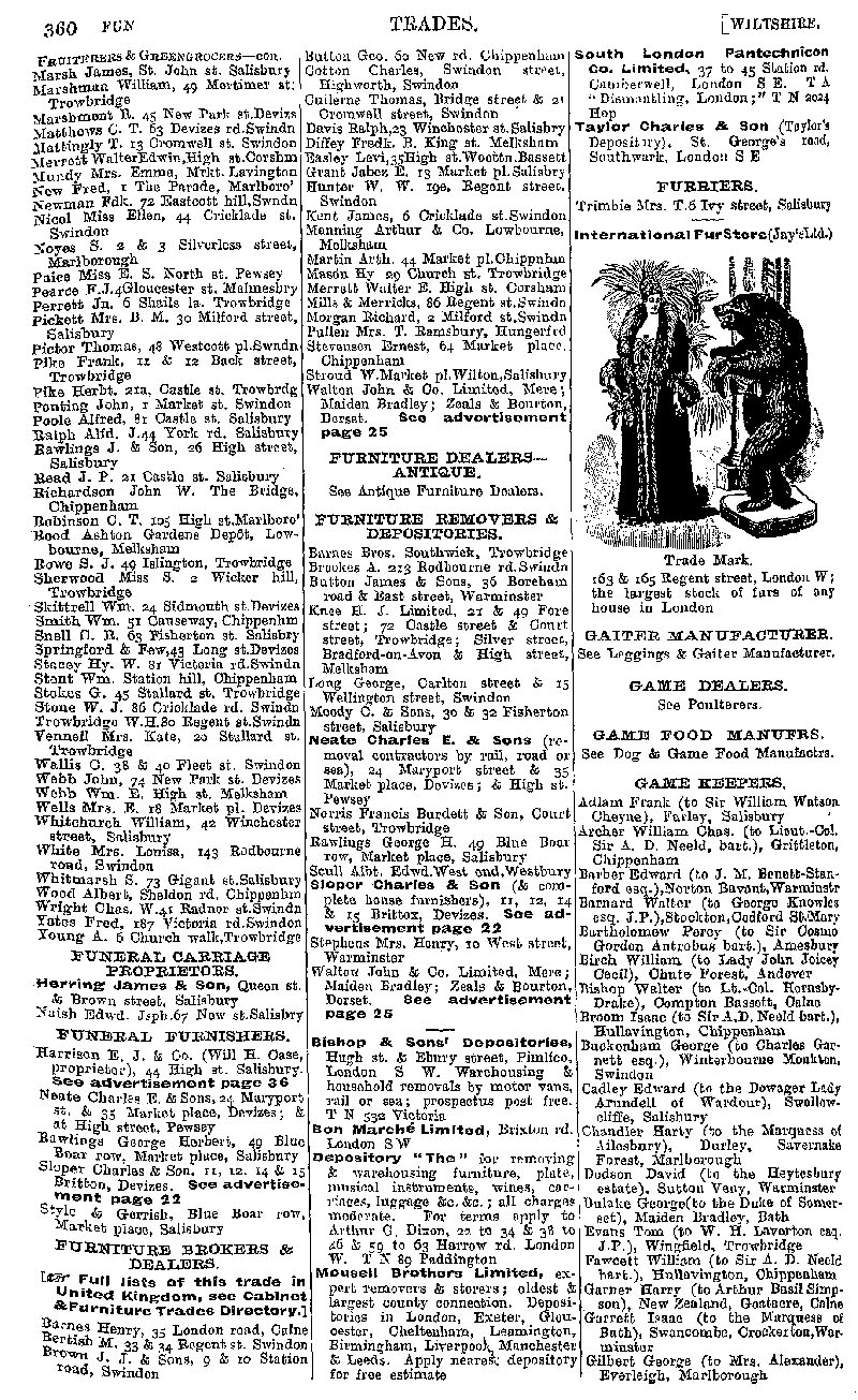 Page 70 Businesses by subject; fruiterers & greengrocers, funeral carriages & furnishers, furniture dealers & brokers, removers & depositories, furriers, game keepers.