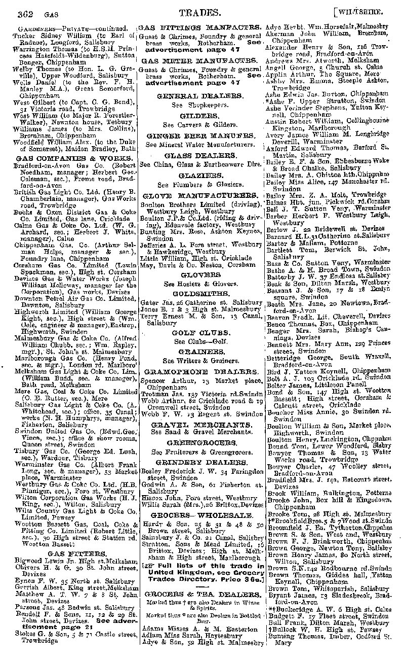 Page 72 Businesses by subject; private gardeners, gas companies & works, gas fitters, glove makers, goldsmiths, gramophone dealers, grindery dealers, grocers & tea dealers (Adams to Bunting).
