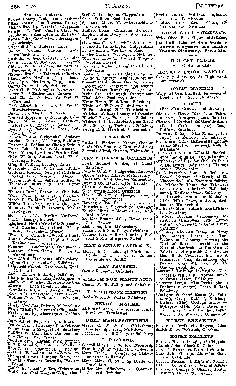 Page 76 Businesses by subject; hauliers, hawkers, hay & straw merchants, hay trusser, hearth rug maker, hearthstone maker, heddle maker, hemp manufacturer, herbalists, hide & skin merchant, hockey stick maker, homes, horse breakers & dealers.