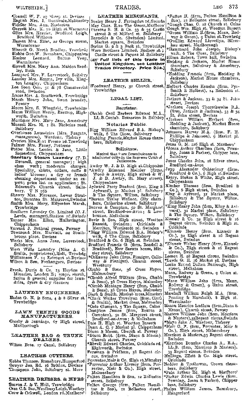 Page 83 Businesses by subject; laundries lundry engineers, lawn tennis goods makers, leather cutters, dressers & manufacturers, merchants & sellers, barrister, notaries, solicitors.