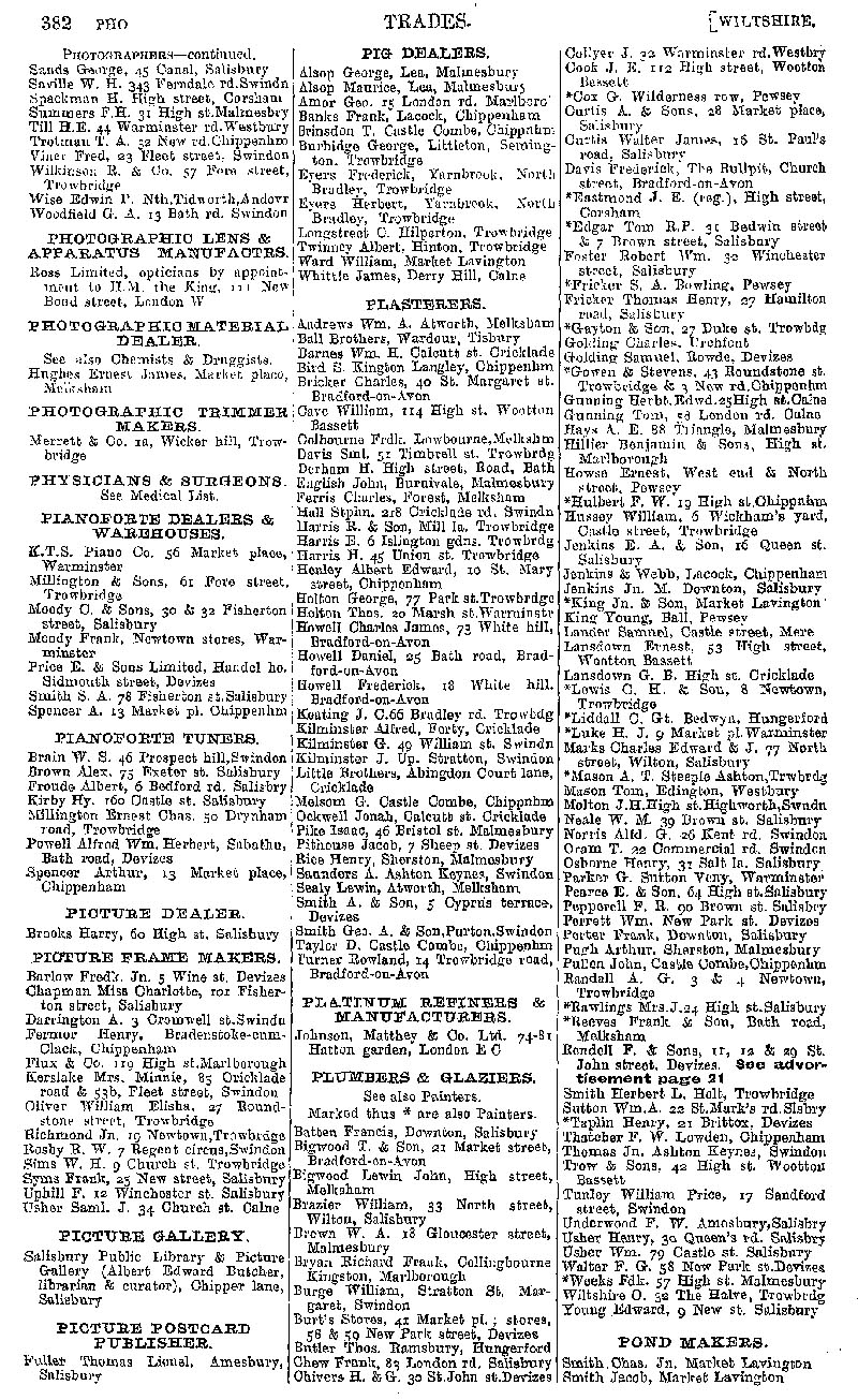 Page 92 Businesses by subject; photographers, Photographic trimmer makers, pianoforte dealers, picture dealer, picture frame maker, picture gallery, postcard publisher, pig dealers, plasterers, plumbers & glaziers, pond makers.