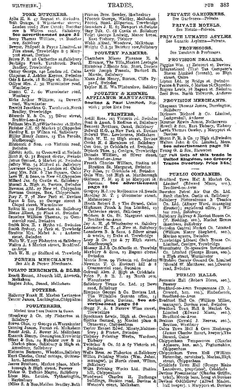 Page 93 Businesses by subject; pork butchers, potato merchants, potter, poulterers, poultry farmers, printers, provision dealers, & merchants, public companies, public halls.
