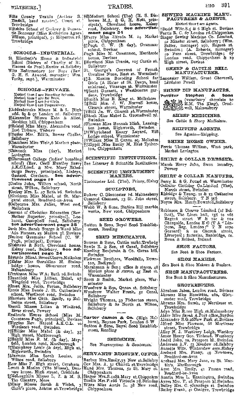 Page 101 Businesses by subject; schools & colleges, scientific instrument makers, sculptors, seed merchants, servants' registry offices, sewing machines, sheep & cattle bell makers, sheep dip makers, shirt & collar makers, shopkeepers (Abraham to Bailey).