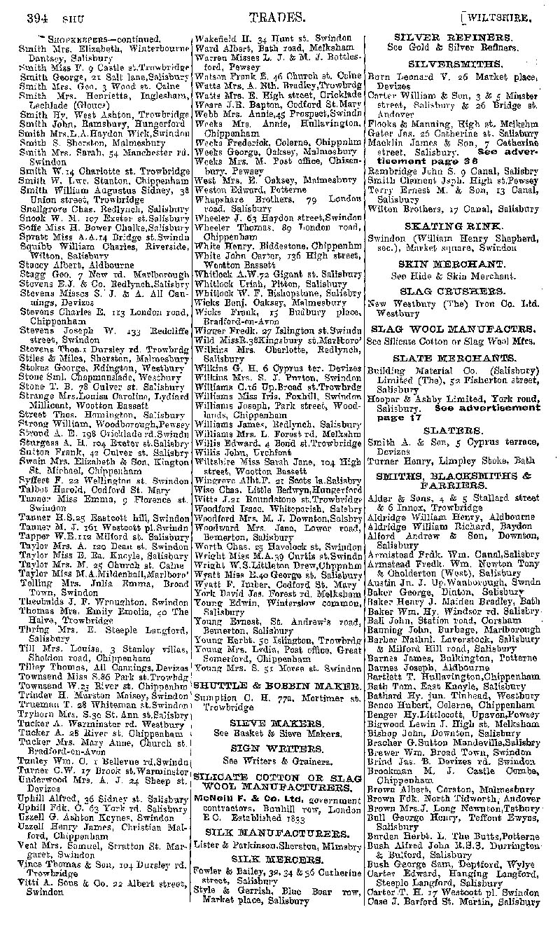 Page 104 Businesses by subject; shopkeepers (Smith to Young), shuttle & bobbin maker, silk manufacturer and mercers, silversmiths, skating rink, slag crusher, slate merchants, slaters, smiths, blacksmiths and farriers.
