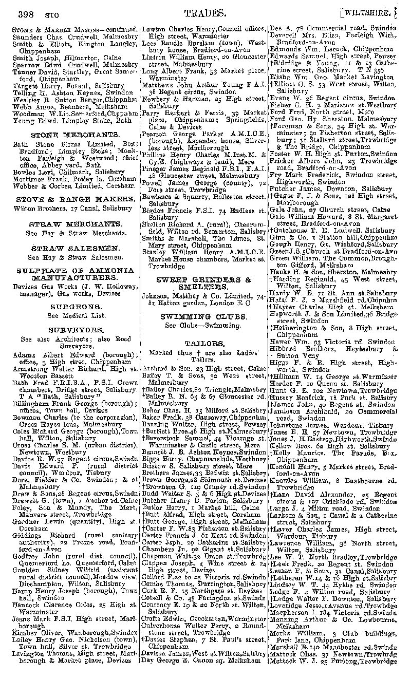 Page 108 Businesses by subject; stone & marble masons, stone merchants, stove & range makers, surveyors, tailors.