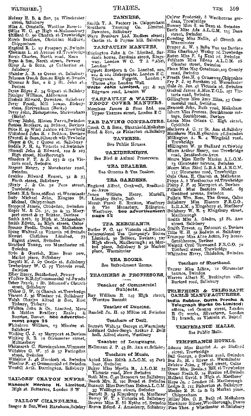 Page 109 Businesses by subject; tailors, tallow chandlers, tanners, tarpaulin makers, tar paving contractors, tea gardens, tea merchants, teachers, temperance hotels.