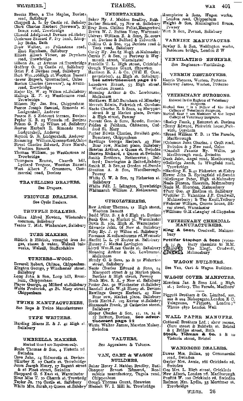 Page 111 Businesses by subject; commercial travellers,truffle dealers, wood turners, type writers, umbrella makers, undertakers, upholsterers, van, cart and wagon builders, vermin destroyers, veterinary surgeons, veterinary chemicals, wagon cover makers, wardrobe