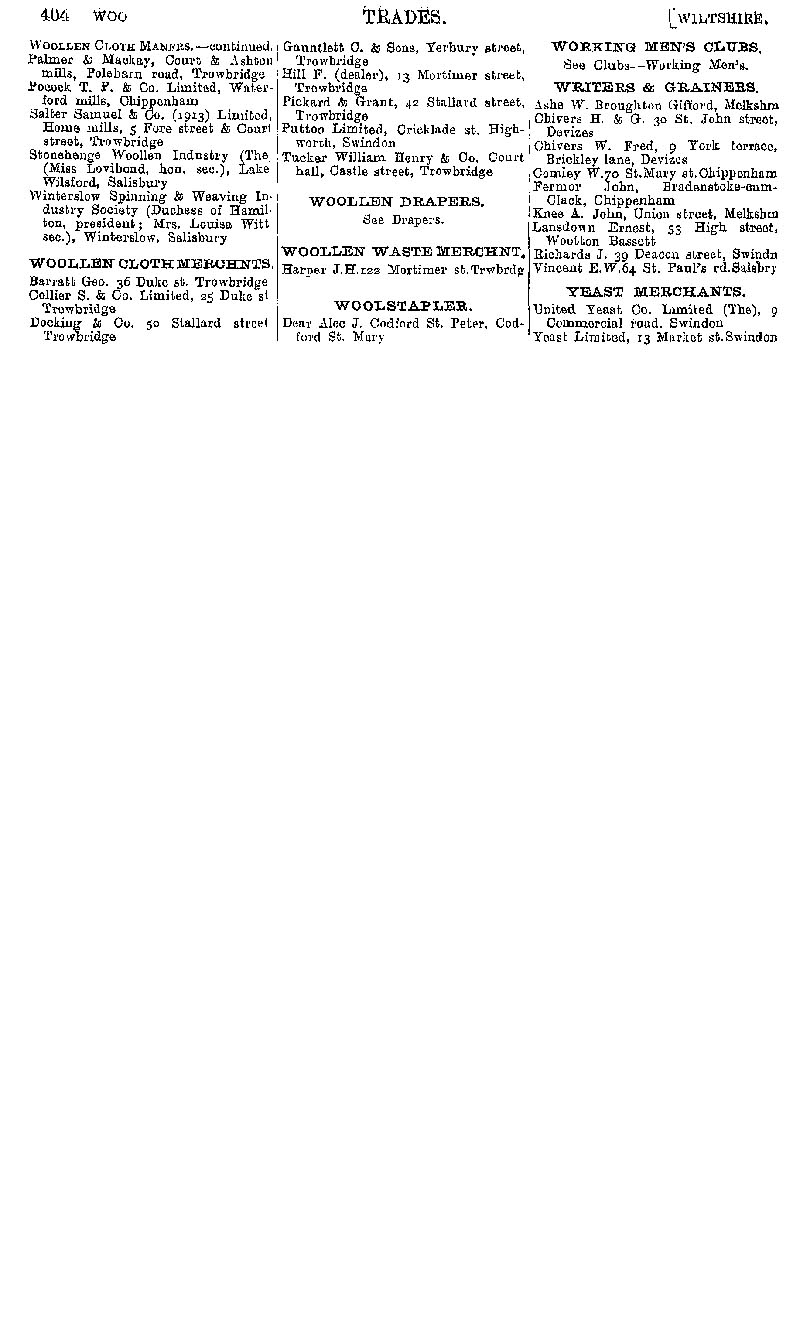 Page 114 Businesses by subject; woollen cloth manufacturers, woolen cloth merchants, woolen waste merchants, woolstapler, writers & grainers, yeast merchants.