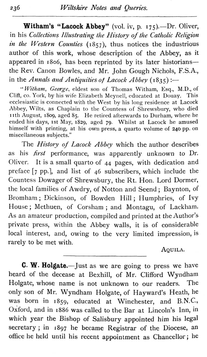Chapter 6 Place House, Melksham; Records of Wiltshire Parishes; Quakerism in Wiltshire; Feet of Fines for Wiltshire; Bush Family; William Snow and Bradenstoek Priory; Geneaology; Melksham Common Rights; Cartularies of Wiltshire Abbeys and Monasteries; Queries; Repl