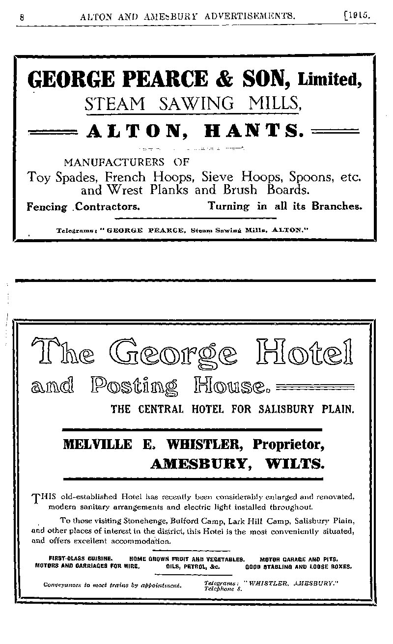 Page 8 Advertisements for George Pearce & Son, Steam Sawing Mills, Alton, and the George Hotel, Amesbury.
