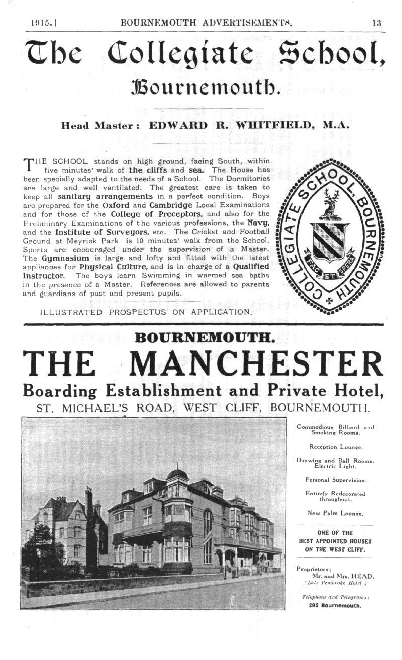 Page 13 Advertisements for the Collegiate School, Bournemouth, and the Manchester Hotel, Bournemouth.