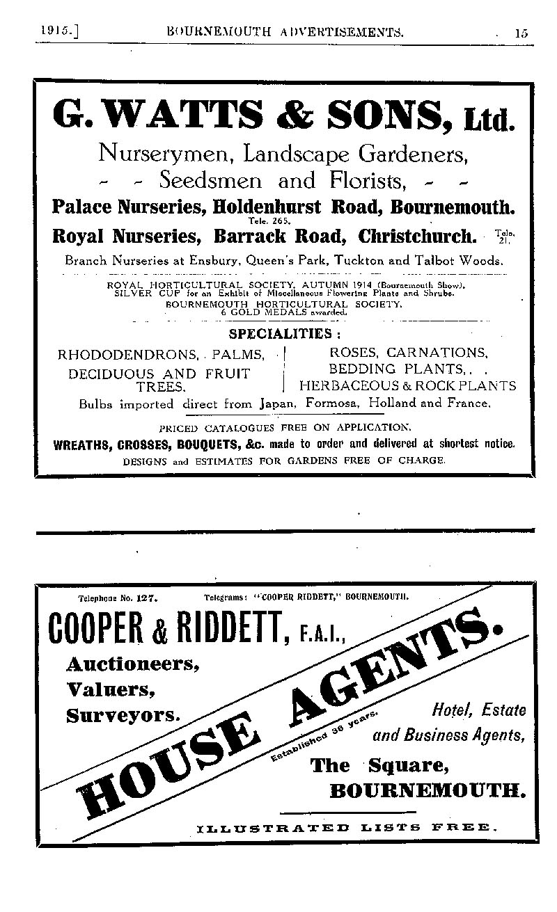Page 15 Advertisements for G. Watts & Sons, nurserymen, Bournemouth and Christchurch, and Cooper & Riddett, house agents, Bournemouth.