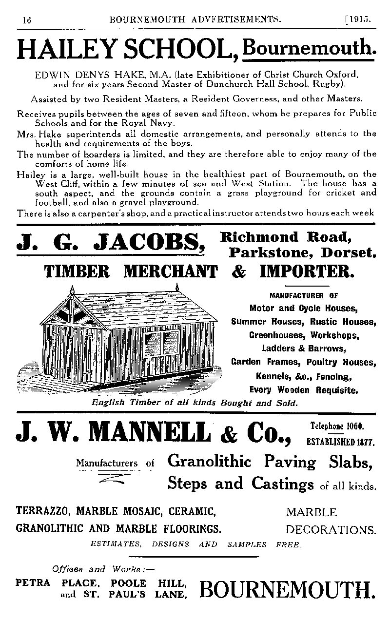 Page 16 Advertisements for the Hailey School, Bournemouth, J.G. Jacobs, timber merchant, Parkstone, and J.W. Mannell & Co. Bournemouth.