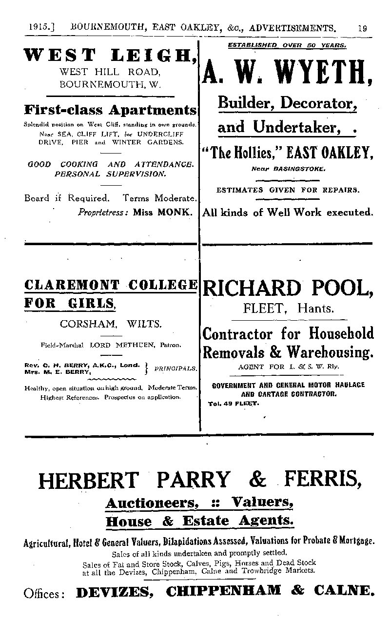 Page 19 Advertisements for West Leigh Apartments, Bournemouth, A.W. Wyeth, East Oakley, Claremont College for Girls, Corsham, Richard Pool, Fleet, and Herbert Parry & Ferris, auctioneers & estate agents, Devizes, Chippenham & Calne.
