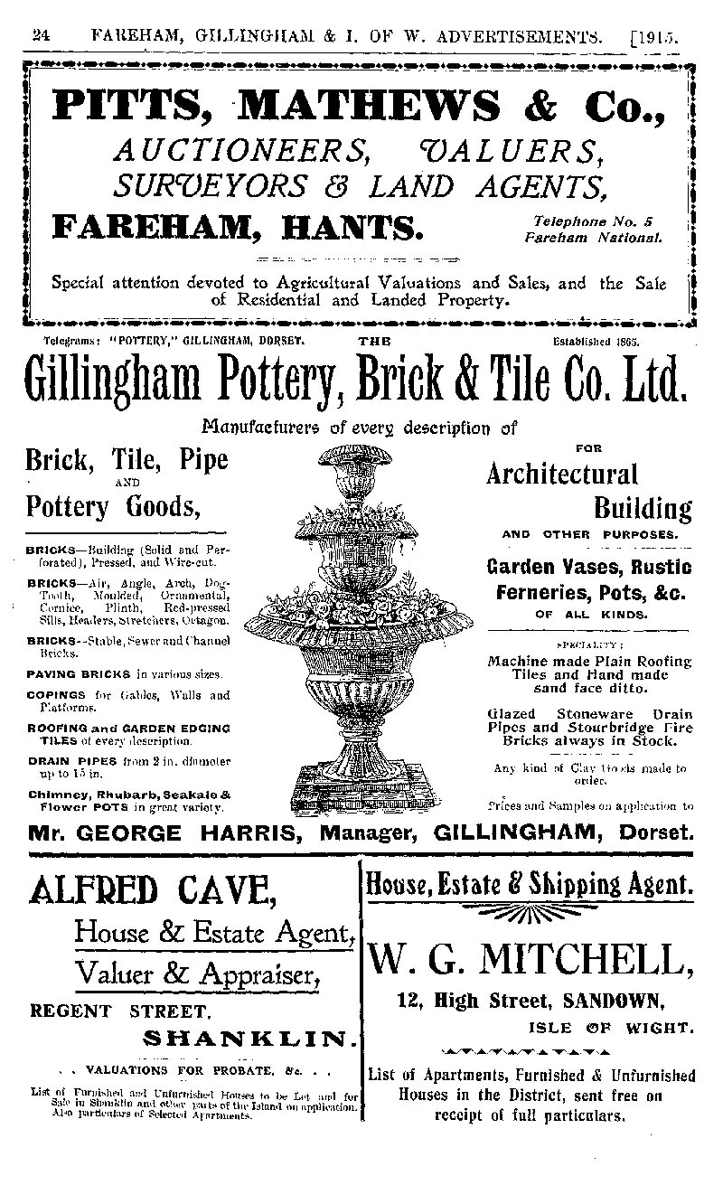 Page 24 Advertisements for Pitts, Mathews & Co. Fareham, the Gillingham Pottery, Brick & Tile Co., Alfred Cave, Shanklin, and W.G. Mitchell, Sandown.