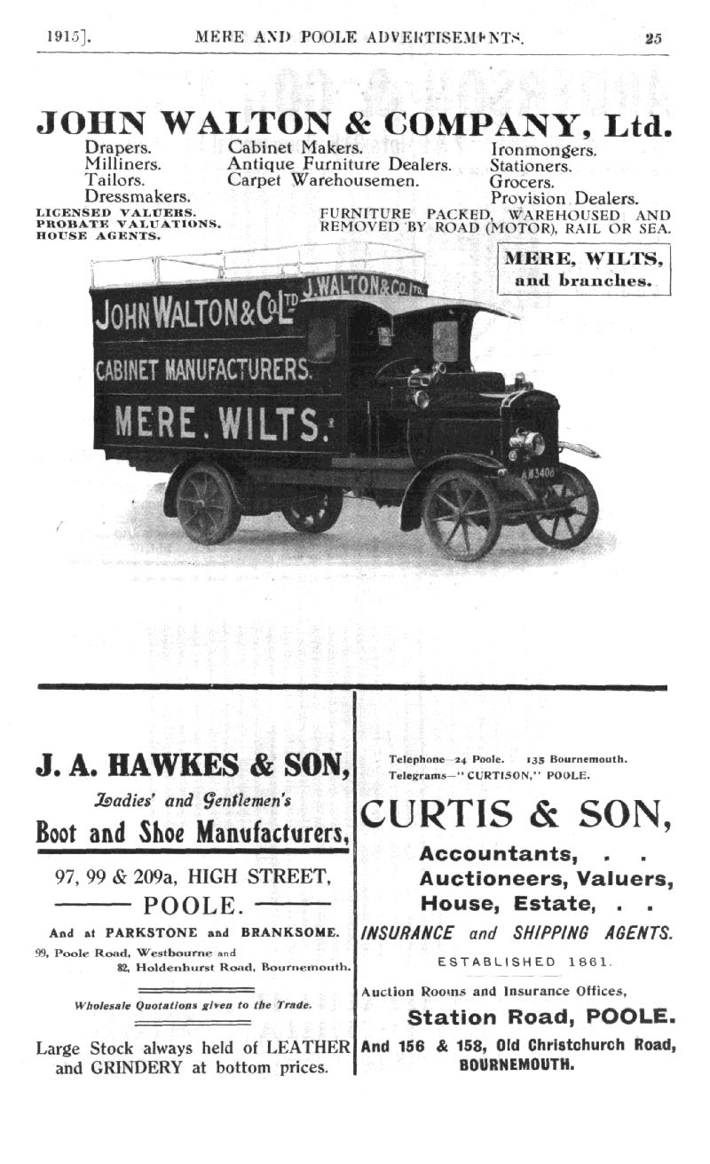 Page 25 Advertisements for John Walton & Company, drapers, furniture, grocers, ironmongery, stationers, etc. Mere, J.A. Hawkes & Sons, Poole, and Curtis & Son, Poole.