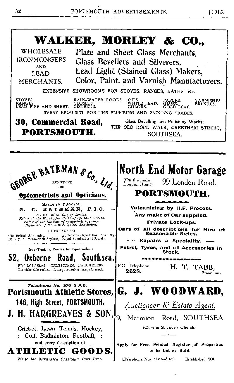 Page 32 Advertisements for Walker, Morley & Co. Portsmouth, George Bateman & Co. Southsea, the North End Motor Garage, Portsmouth, the Portsmouth Athletic Stores, and G.J. Woodward, Southsea.