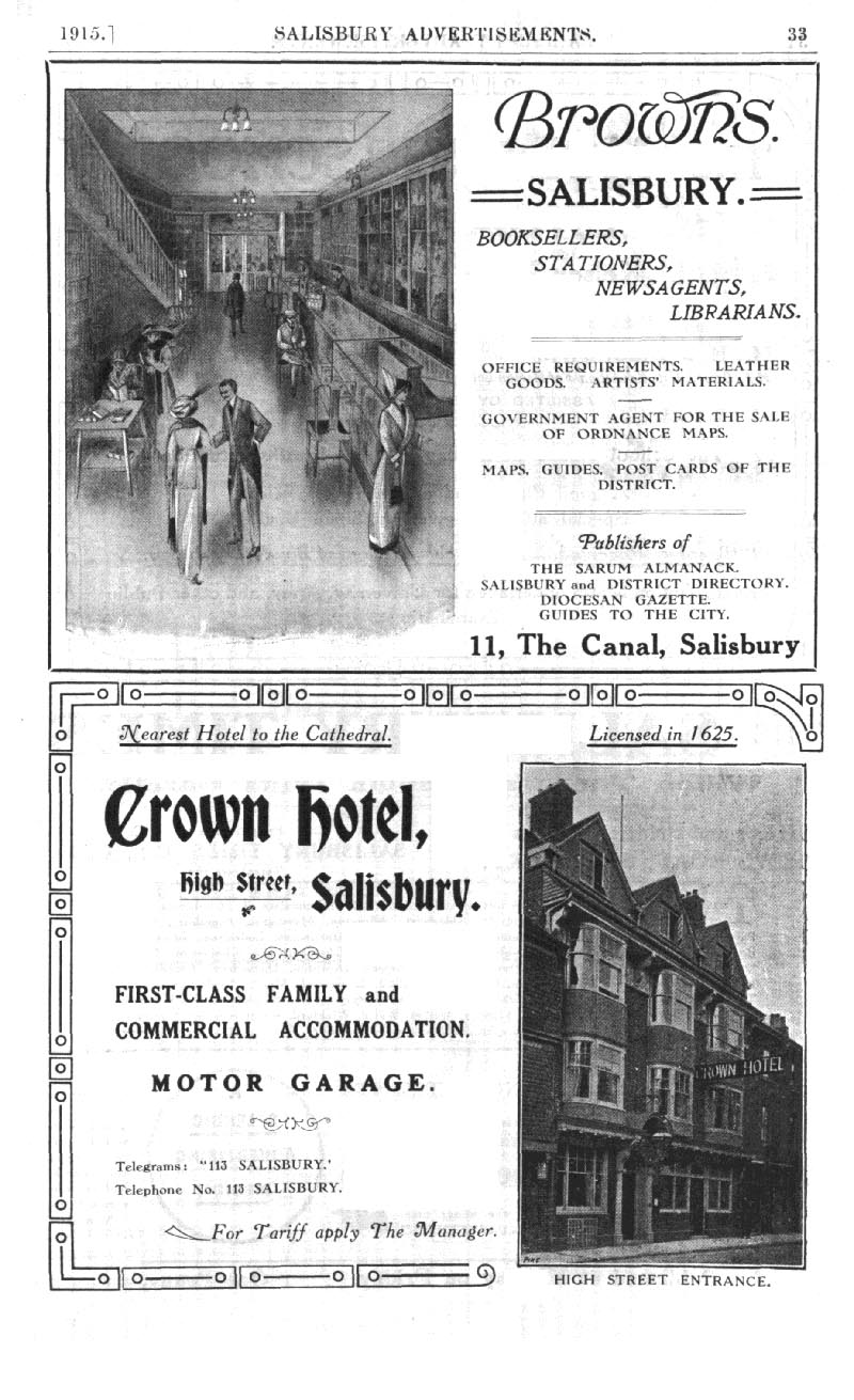 Page 33 Advertisements for Browns of Salisbury, booksellers & stationers, and the Crown Hotel, Salisbury.