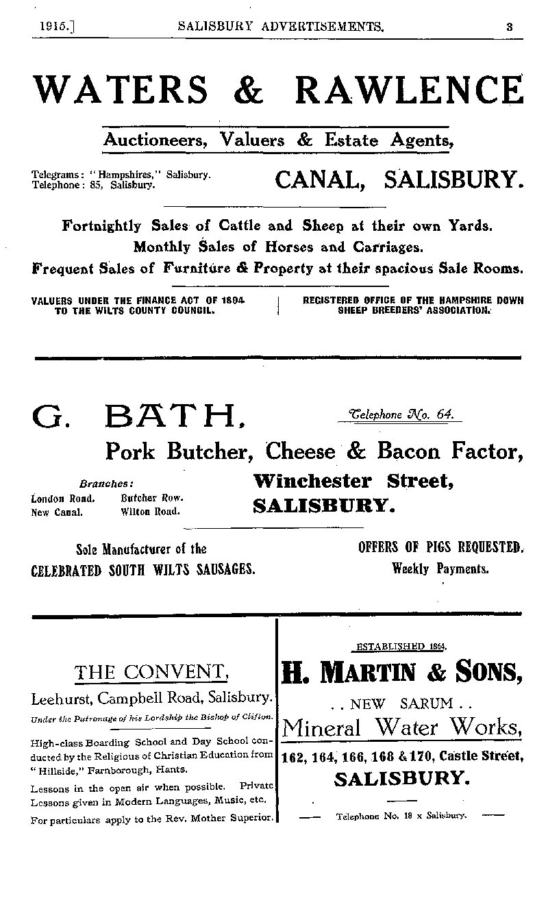 Page 35 Advertisements for Walters & Rawlence, auctioneers & estate agents, Salisbury, G. Bath, pork butcher, Salisbury, the Convent School, Salisbury, and H. Martin & Sons mineral water works, Salisbury.