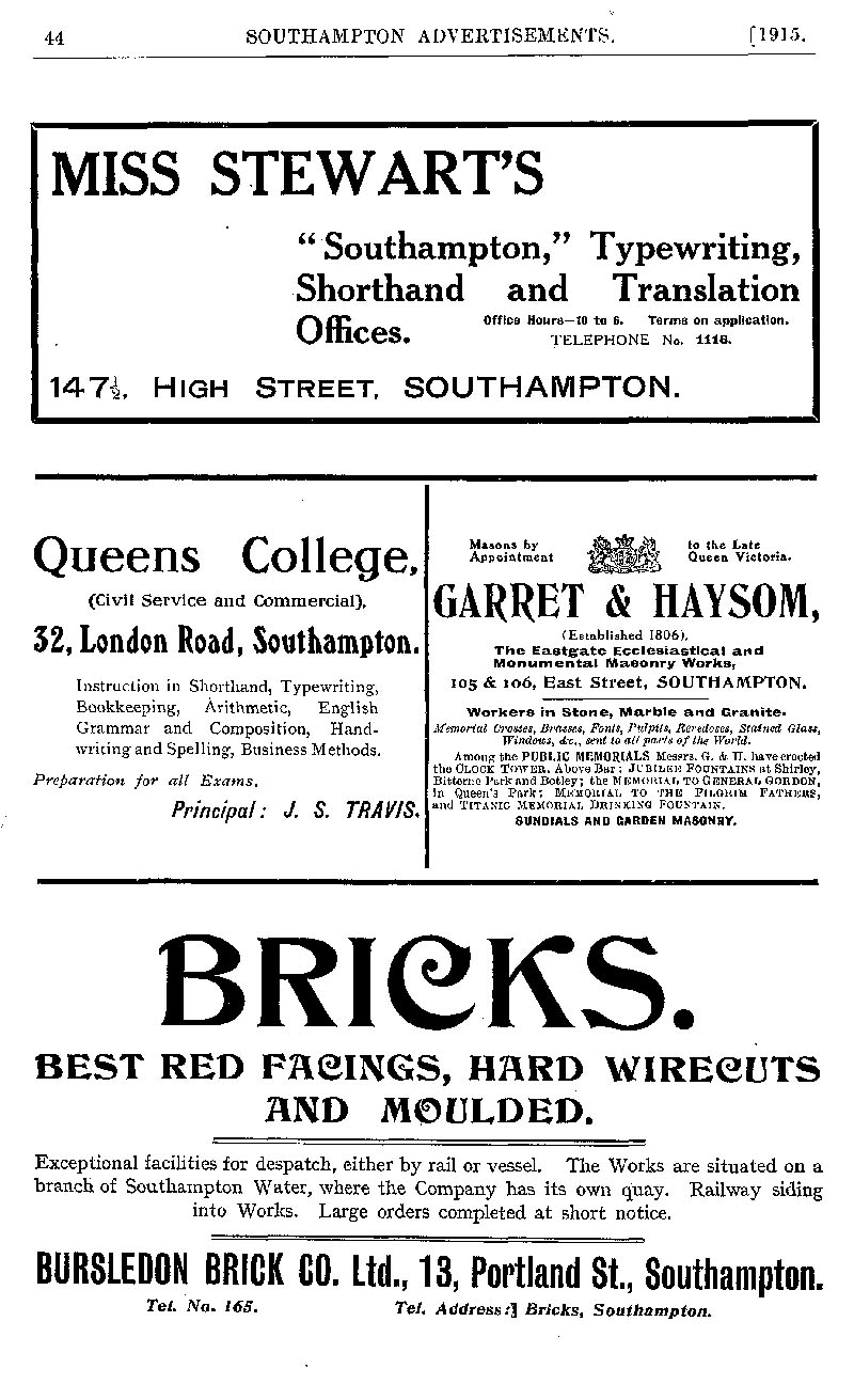 Page 44 Advertisements for Miss Stewart's \"Southampton\" Typewriting, Shorthand and Translation Offices, Queen's College, Southampton, Garret & Haysom, Southampton, and the Bursledon Brick Co. Southampton.
