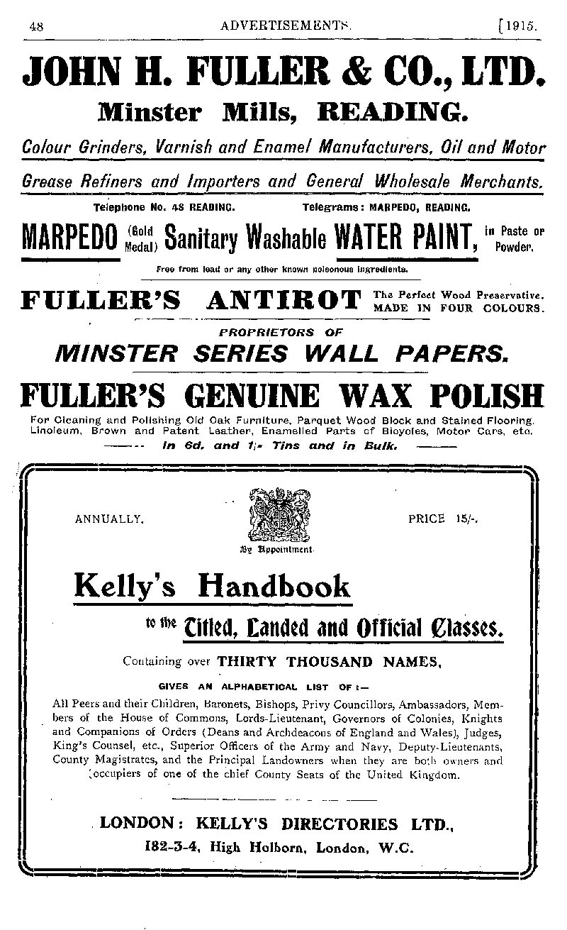 Page 48 Advertisements for John H. Fuller & Co. Minster Mills, Reading, and Kelly's Handbook.