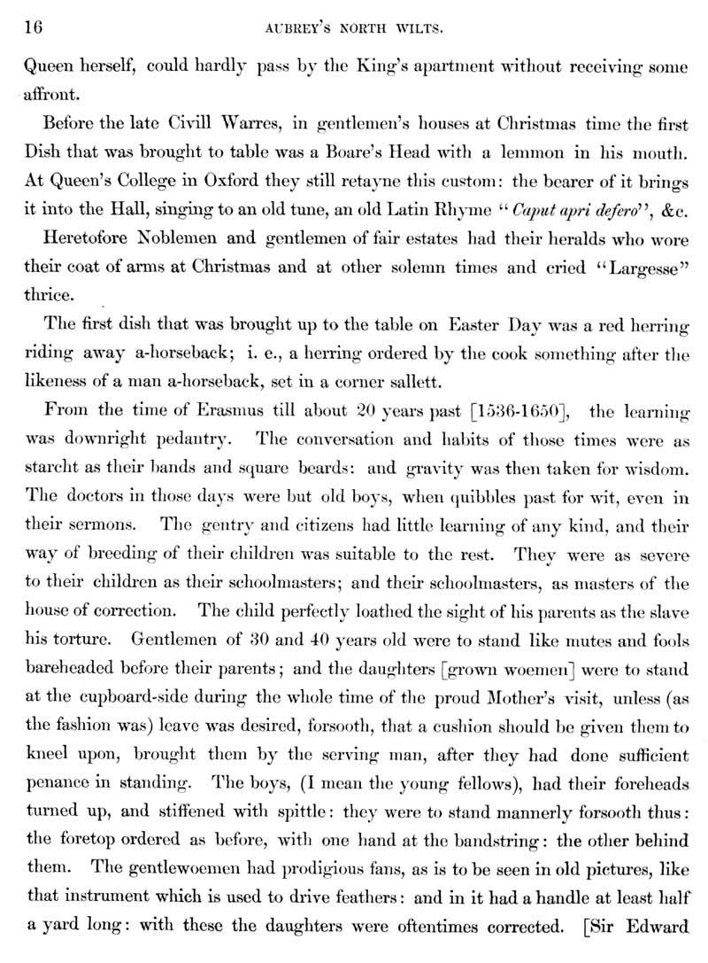 Page 31 John Aubrey's preface; Wiltshire, boar's head at Christmas, food at Easter, upbringing of children.