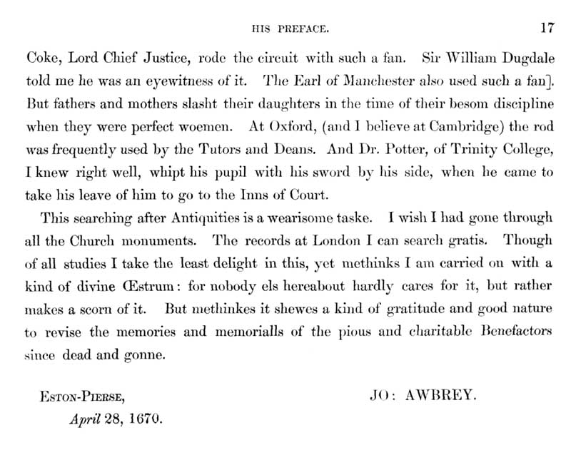 Page 32 John Aubrey's preface; Wiltshire, upbringing of children and punishments.