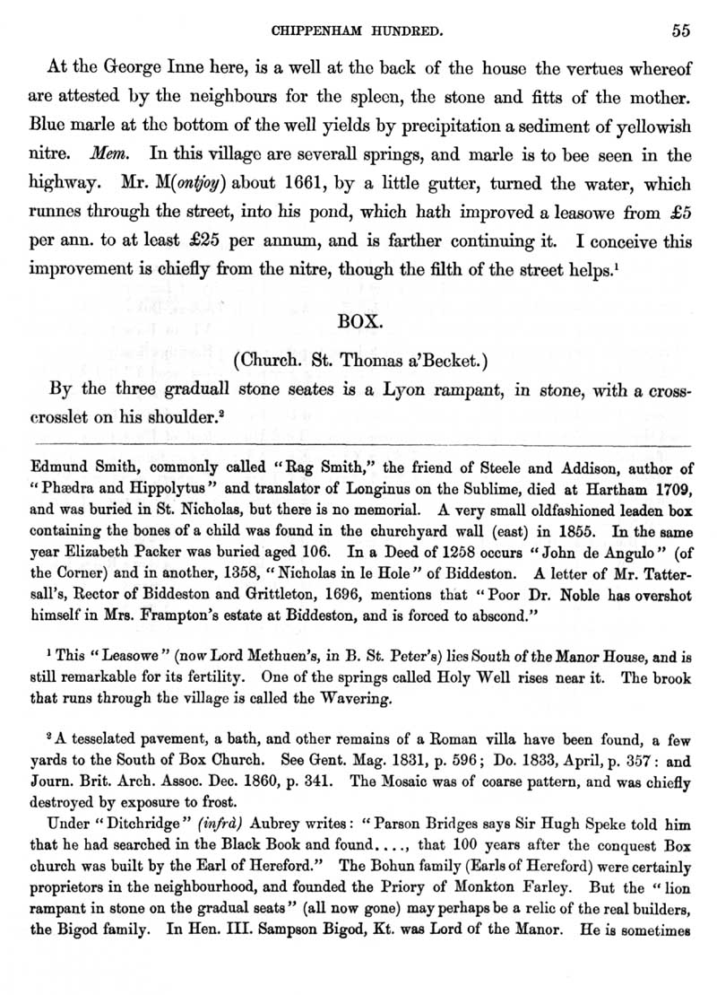 Page 10 History of Biddestone, well and springs, descent of the manor. History of Box. Roman villa, Ditteridge.