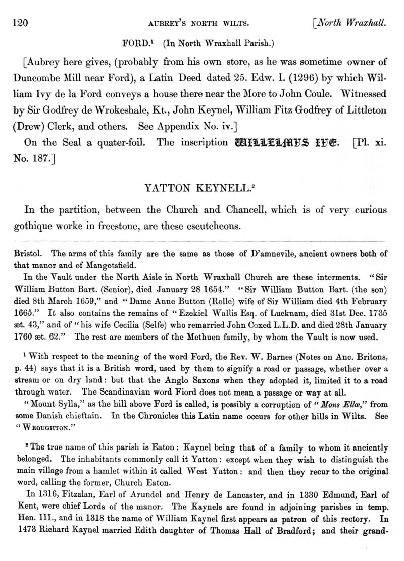 Page 75 History of North Wraxall; the church, descent of manor, Ford. History of Yatton Keynell; the church, descent of manor.