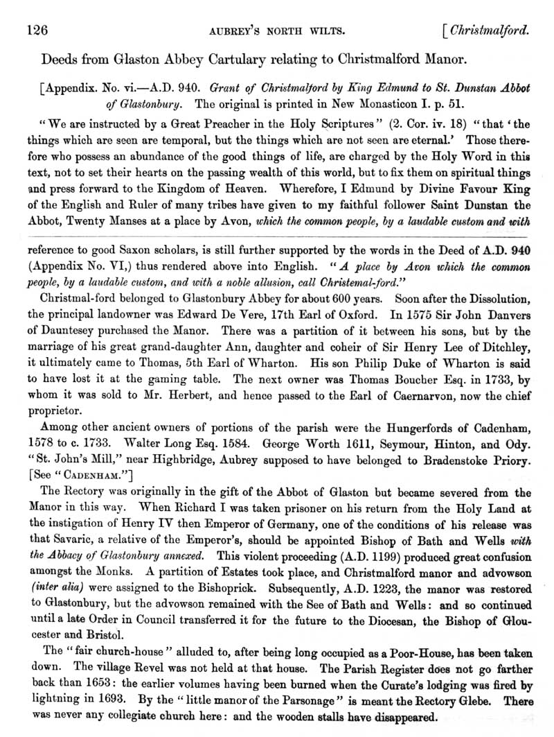 Page 3 History of Christian Malford; meaning of name, Glastonbury Abbey deeds, rectory and church house.