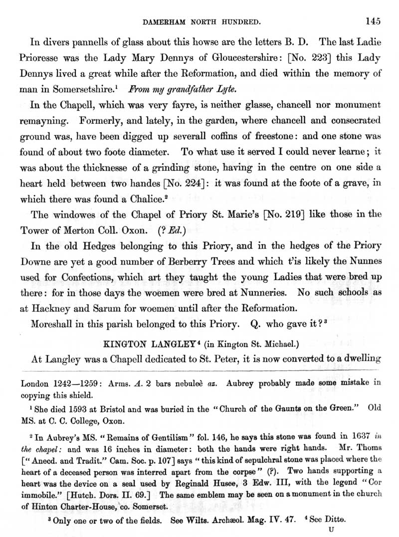 Page 22 History of Kington St. Michael; deeds of the manor, Priory of St. Mary, chapel. History of Kigton Langley.