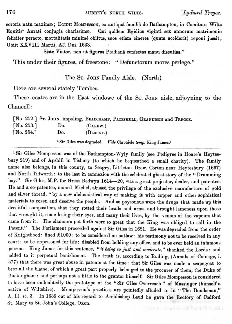 Page 16 History of Lydiard Tregoze; the church, monuments and arms of the St. John family, Sir Giles Mompesson.