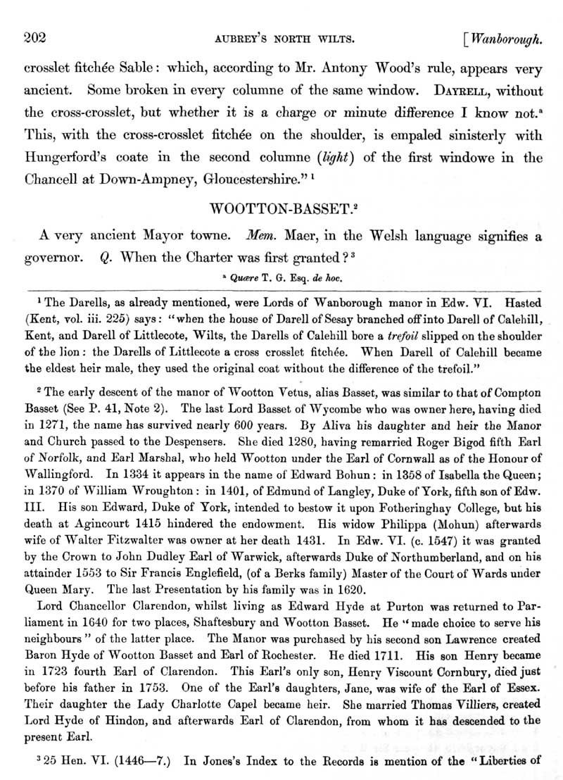 Page 42 History of Wanborough; church of St. Andrew, monuments and inscriptions, Hinton family, Darell family. History of Wootton Bassett.