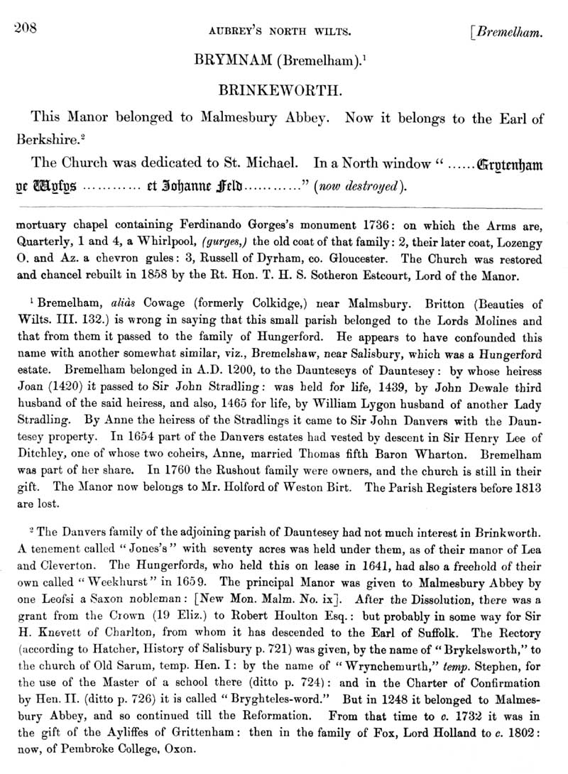Page 3 History of Ashley (now in Gloucestershire). History of Bremilham. History of Brinkworth, landowners.