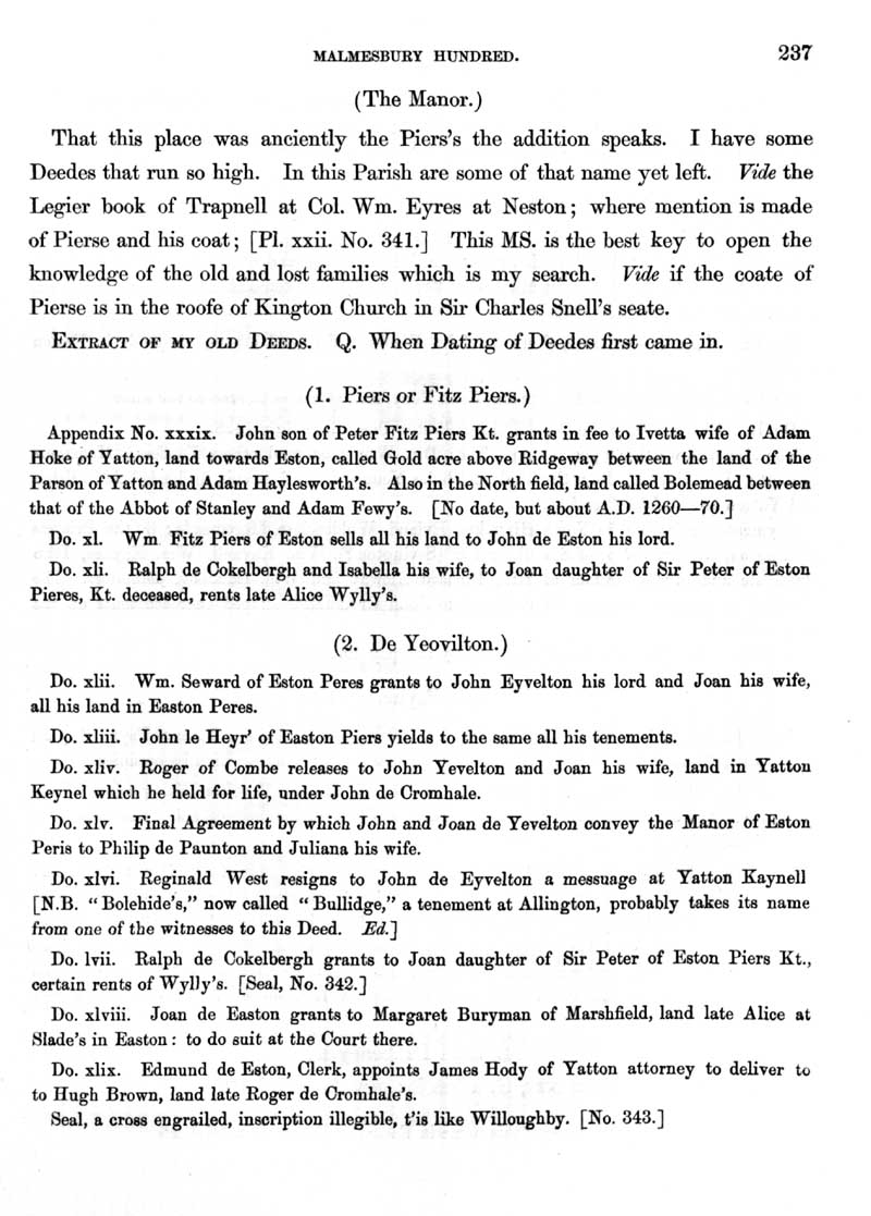 Page 33 History of Easton Piercy (Kington St. Michael); manor, Fitz Piers family, de Yeovilton family.