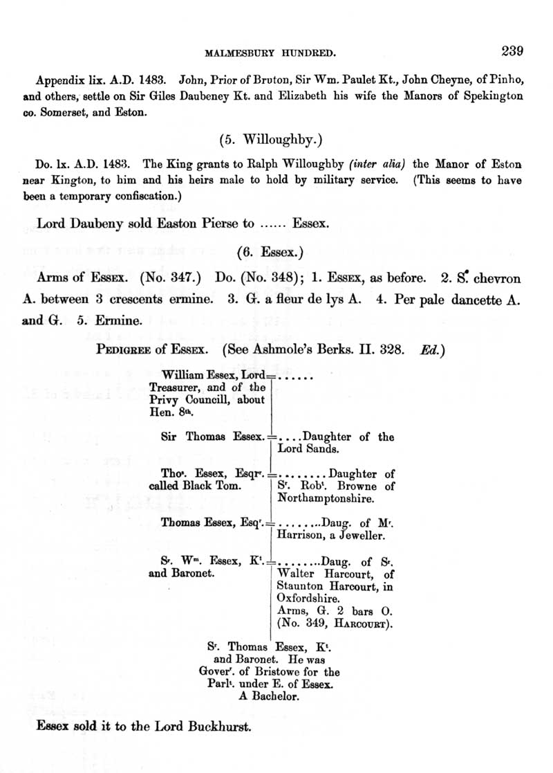 Page 35 History of Easton Piercy (Kington St. Michael); deeds relating to Lord Daubeny, Ralph Willoughby, Lord Essex.