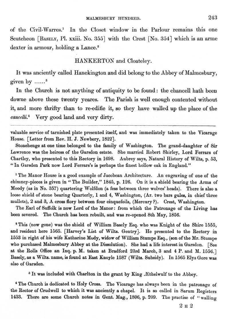 Page 39 History of Garsdon (in Lea and Cleverton parish); manor house, Washington family. History of Hankerton, the church.