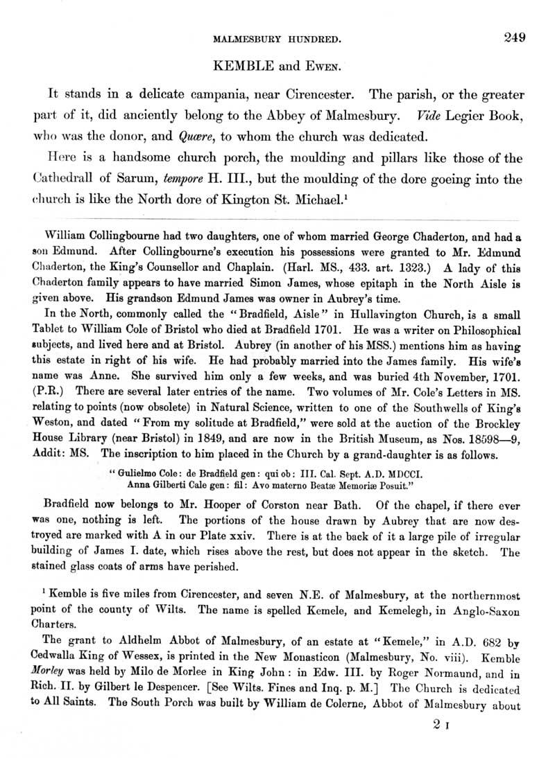 Page 45 History of Hullavington; Bradfield, Collingbourne family. History of Kemble (now in Gloucestershire).