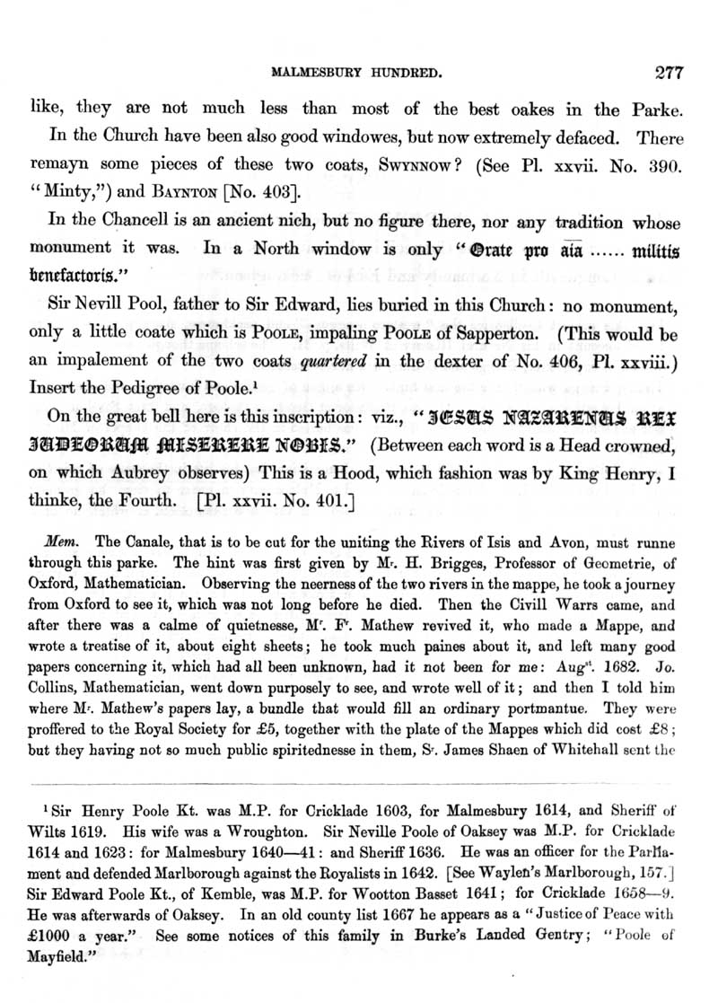 Page 73 History of Oaksey, Oaksey Park and Sir Edward Poole, the church, proposed canal between the rivers Thames and Avon, the Poole family .