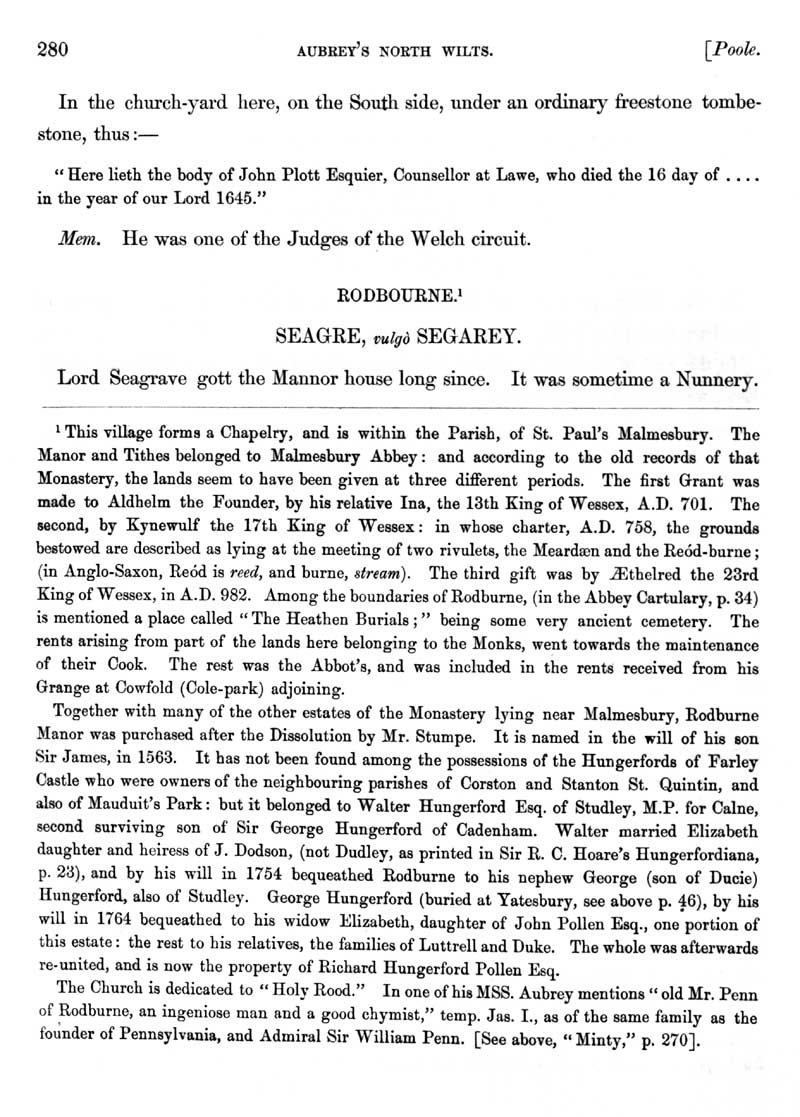 Page 76 History of Poole Keynes (now in Gloucestershire), the church and monumental inscriptions. History of Rodbourne. History of Seagry.
