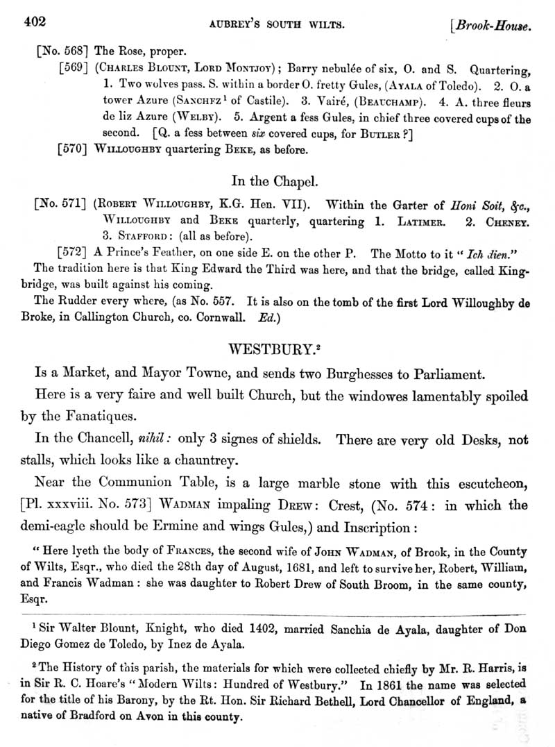 Page 4 History of Brook House, description of rooms and coats of arms, chapel. History of Westbury, the church.